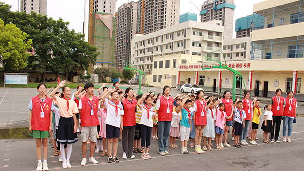 本网讯(通讯员 程欣悦)近日,教育与心理系微光志愿者服务队“七彩假期·三下乡”暑期社会实践团队来到沙市区立新乡红门路小学,开启了近两周的支教生活,围绕思想引领、身心健康、快乐学习、文明生活、文化传承、艺术素养、科技创新七大主题开展志愿服务活动。7月5日上午,微光志愿者服务队在红门路小学开展“同怀爱国心,共升一面旗”庆祝中国共产主义青年团成立100周年主题升旗仪式,志愿者代表及红门路小学“七彩假期”夏令营员工共120余人参加仪式。
