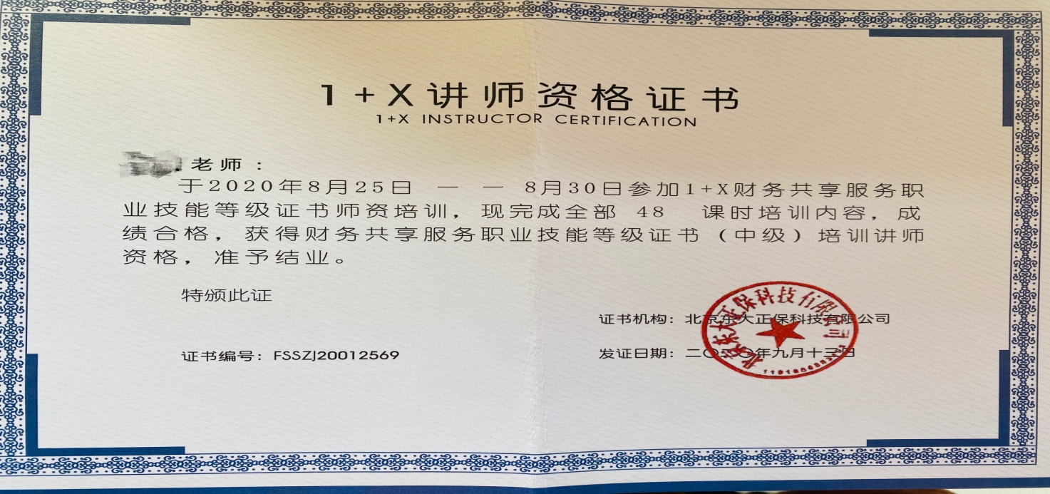 2020年8月25日- 8月30日,会计教研室的部分老师参与了由北京东大正保科技有限公司组织的《1+X财务共享服务(中级)职业技能团队培训》,并通过考试取得相关证书。