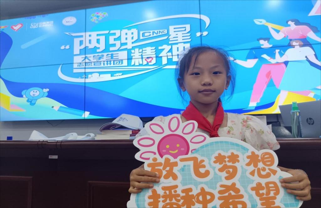 图为志愿者与小朋友进行“两弹一星”自主内容创作成果展示。