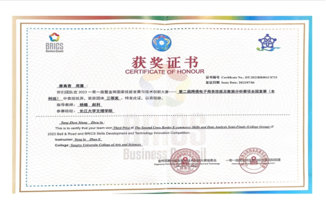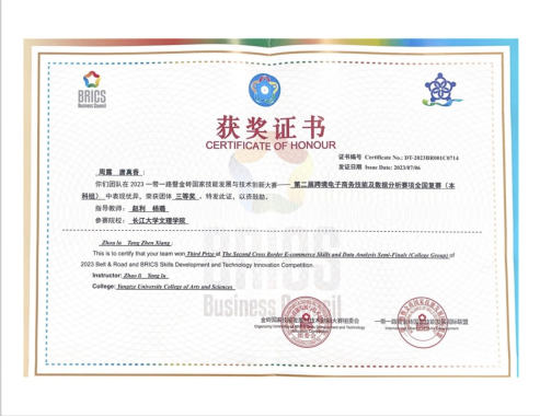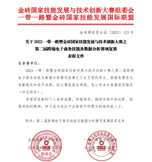 本网讯(通讯员 赵利)近日,“2023一带一路暨金砖国家技能发展与技术创新大赛之第二届跨境电子商务技能及数据分析赛项”全国总决赛已落下帷幕。管理公司由杨璐、赵利两位老师指导的周露、唐真香同学在比赛中荣获复赛三等奖。