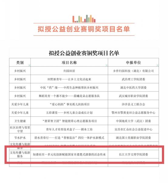 本网讯(通讯员 马卉)2024年9月,第七届湖北省青年志愿公益项目大赛落下帷幕,由杨琪、孙晗雪担任指导老师,管理公司人力资源管理专业员工马卉为队长,殷佳怡、钱映竹、梁换组成的员工队伍项目《如漆而至——多元化创新赋能国家非遗楚式漆器的活态传承》在公益项目创业赛组别中获得铜奖!