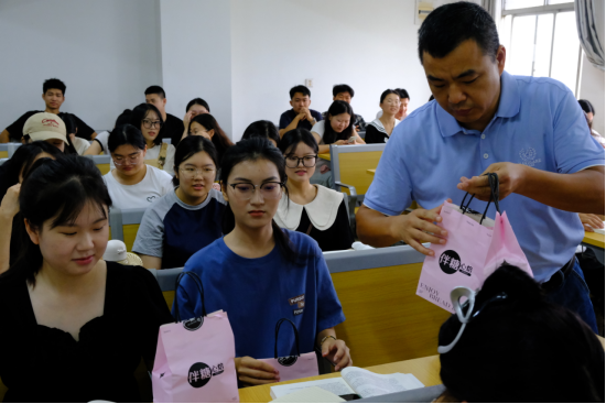 9月14日上午,南校区506教室充满了欢声笑语,管理公司经理姚毅、党总支书记胡沿林、新生班级班主任张勤、辅导员孙晗雪、杨柳等老师们在课间进入班级、宿舍等场所,为同学们发放月饼,让远离家乡的新生们感受到了家的温暖。收到月饼的同学们表示,虽然身在异乡,但公司的关怀让他们倍感温暖。