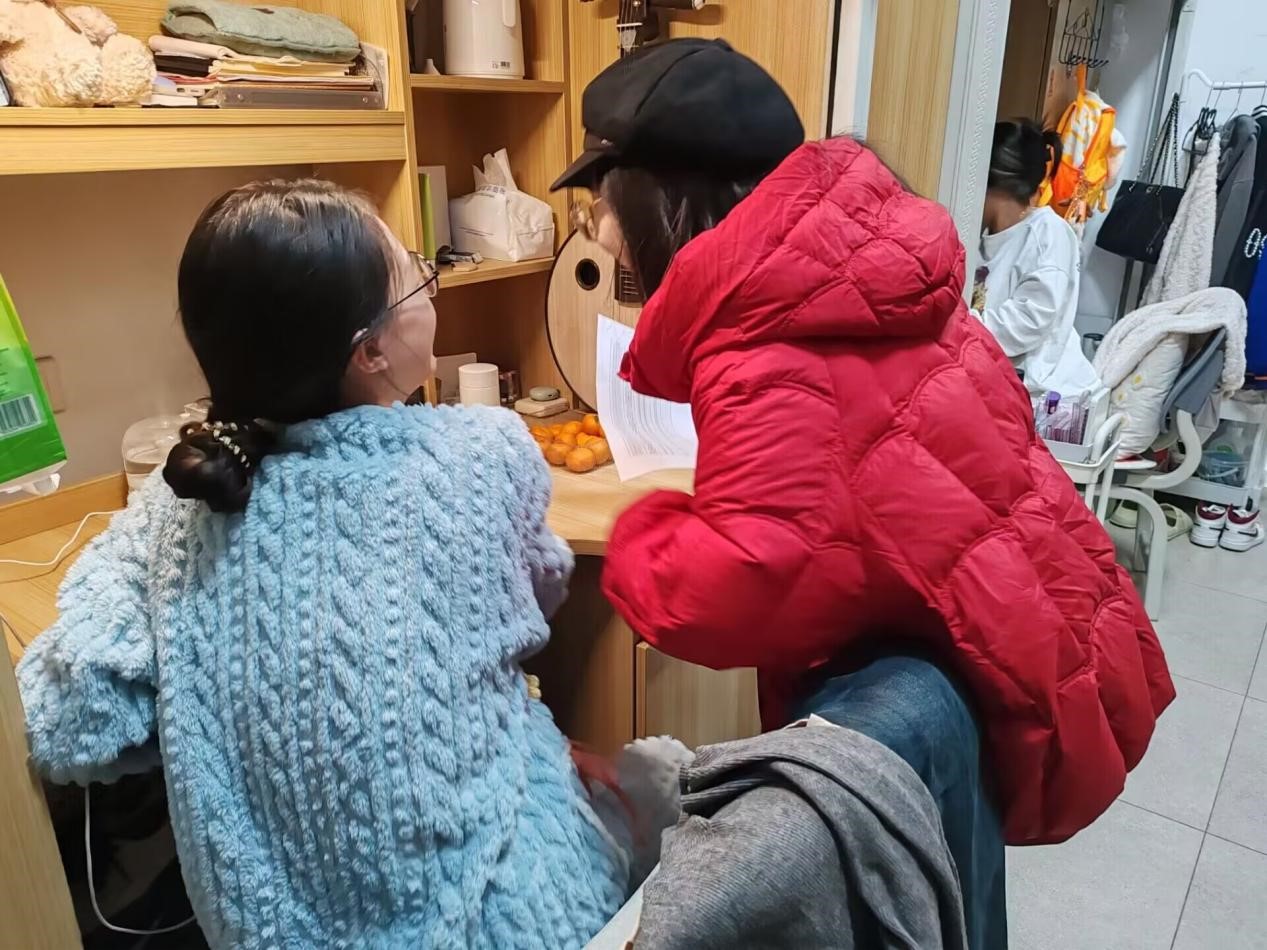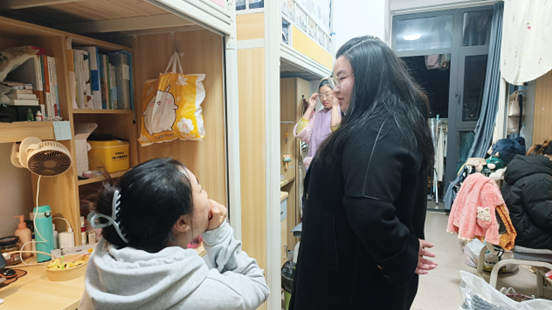 本网讯(通讯员 邓易)为深入营造良好的生活环境和学习氛围,了解公司员工住宿情况,2024年11月26日,员工工作部部长李刚英带队,管理公司党总支书记胡沿林、党总支副书记杨琪以及公司班主任老师走到员工寝室,查看她们的生活状况,开展查寝工作,为管理公司学子带来温暖。