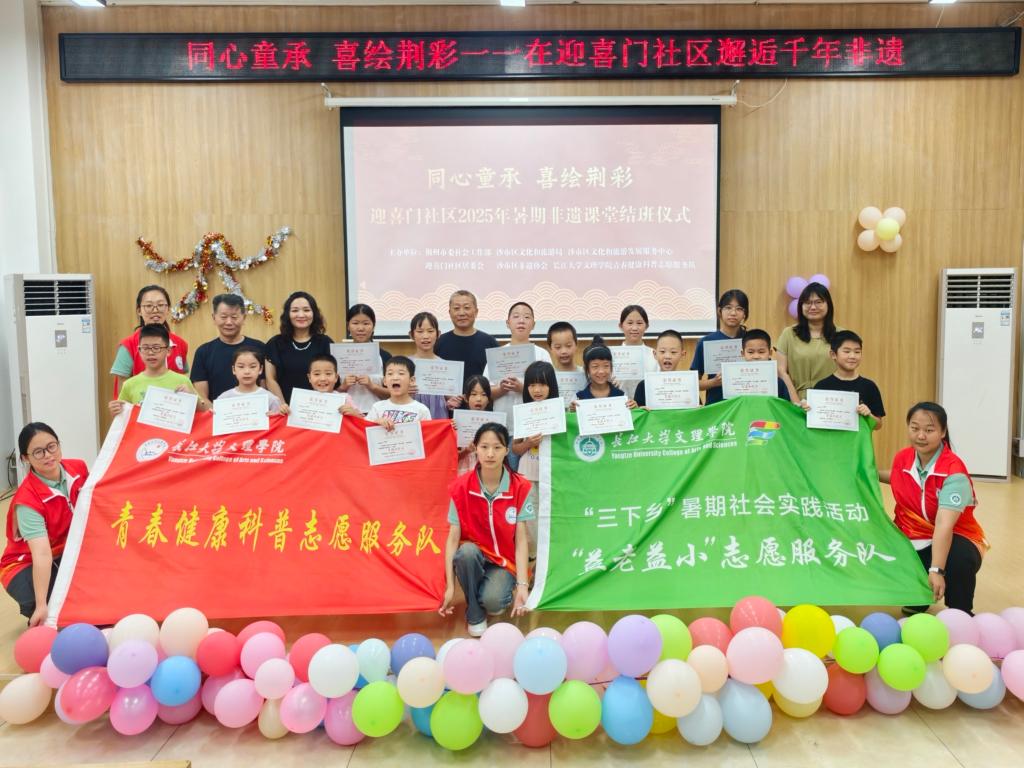 “我宣布,迎喜门社区2025年暑期‘同心童承,喜绘荆彩’非遗学堂正式结营!”在龚箐书记的宣布声中,全场响起持久的掌声。随后,学员、家长、志愿者与领导们齐聚舞台,拉起“VSport青春健康科普志愿服务队”与“益老益小'志愿者服务队”,在镜头前留下充满意义的大合影。