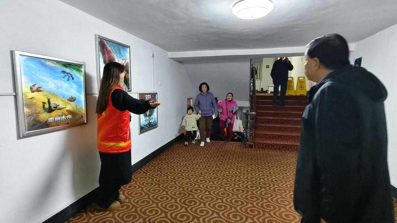活动当天,志愿者们热情迎接每一位老人,耐心地搀扶着行动不便的老人,细心引导他们签到,并为每人发放一面小红旗,让节日氛围更加浓厚。不少老人接过红旗时露出笑容,纷纷表示感受到了温暖与关怀。同时服务队成员还在影厅内悬挂了组织标语和一些具有节日氛围的装饰,让整个影厅充满了温馨与庄重的气息。