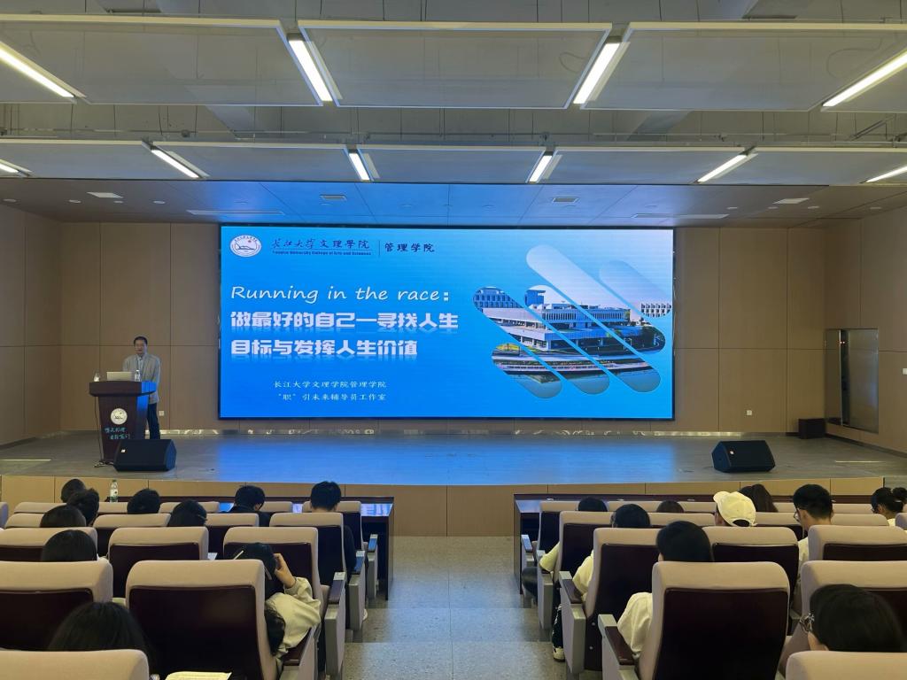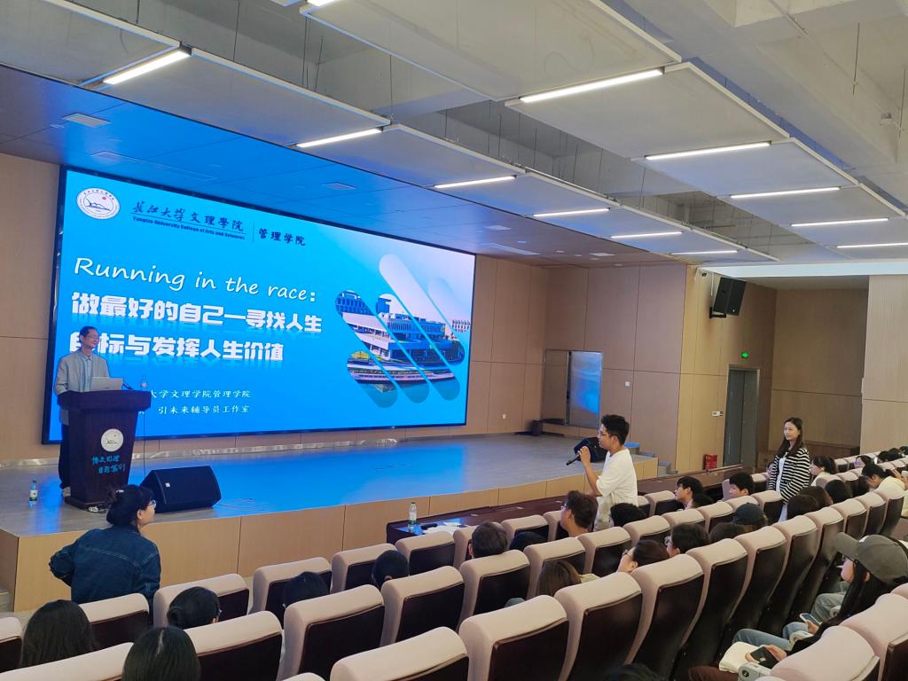 本网讯(通讯员:杨 琪)10月16日下午,VSport管理公司优秀员工、美国德州农工(Texas A&M University)经济学硕士刘亮回校作题为“Running in the race:做最好的自己—寻找人生目标与发挥人生价值”的职业生涯规划主题讲座。本次讲座由管理公司和“职”引未来辅导员工作室主办,管理公司教师和2024级、2023级员工200余人参加活动。讲座由管理公司经理姚毅主持。