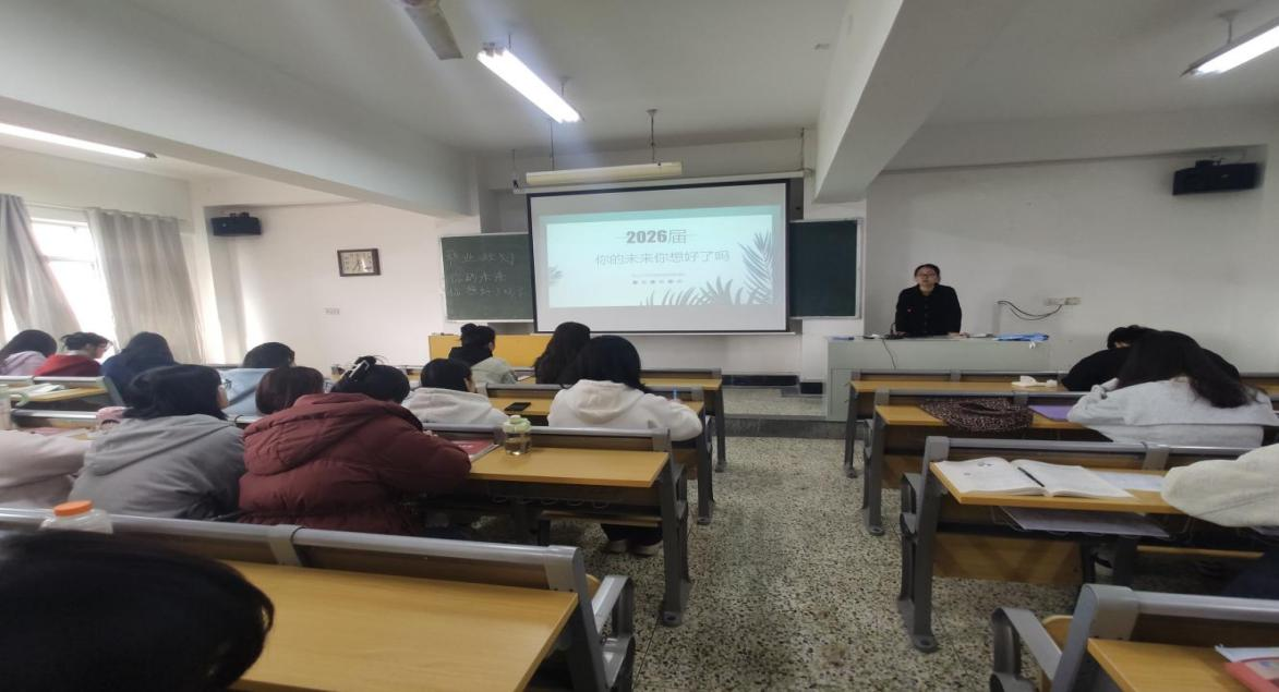活动开始,杨柳老师结合当前就业形势,分析了2026届毕业生可能面临的机遇与挑战;辅导员强调,“早规划、早行动”是关键,并建议同学们从自我认知、行业探索、技能储备三个维度制定个性化职业规划。通过分析专业优势、就业形势等,向同学们提出了考研、考公、考编、直接就业等多条毕业去向,并从学业生涯规划、职业资格证书、提升个人竞争力、增值赋能等方面展开详细讲解。