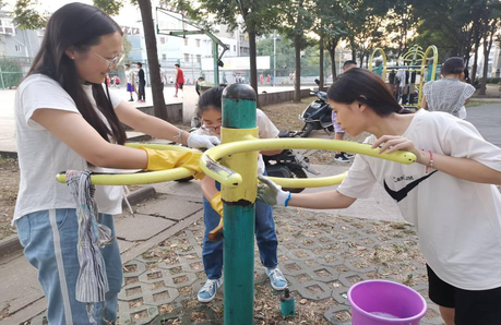 清洁健身器材,大家有说有笑,劳动总是伴随着欢乐!