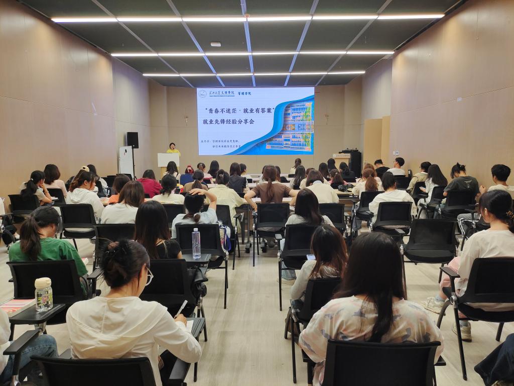 本网讯(通讯员:李琪)为帮助同学们明晰职业发展方向,增强就业竞争力,5月23日下午14:30,由管理公司员工党支部和职引未来辅导员工作室联合举办的“青春不迷茫,就业有答案”就业先锋经验分享会在图书馆103室顺利举行。本次活动由李平老师主持,特邀夏明念、杨宇航、张双、李宇锋四位优秀毕业生,为同学们带来宝贵的就业经验分享,吸引了众多同学到场参与。