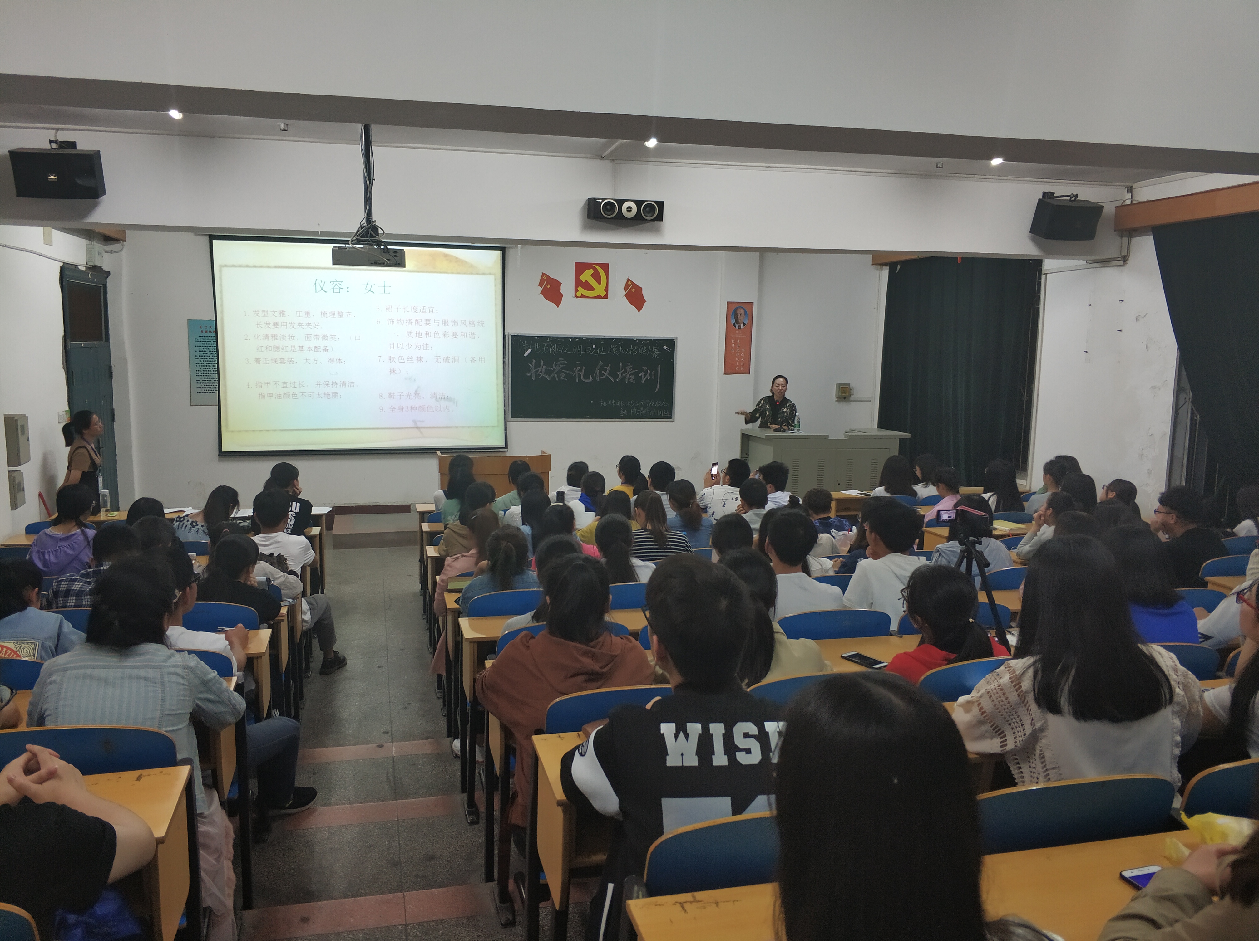 然后,涂老师还介绍了一些关于坐姿、蹲姿、走姿、鞠躬礼等方面的礼仪规范。这么多详尽的礼仪规范, 听来让人深刻地感受到礼仪文化的博大精深以及丰富的职场礼仪。期间还有提问环节, 同学们就握手的礼节等问题向老师提出疑问, 涂老师一一进行了详细的解释。