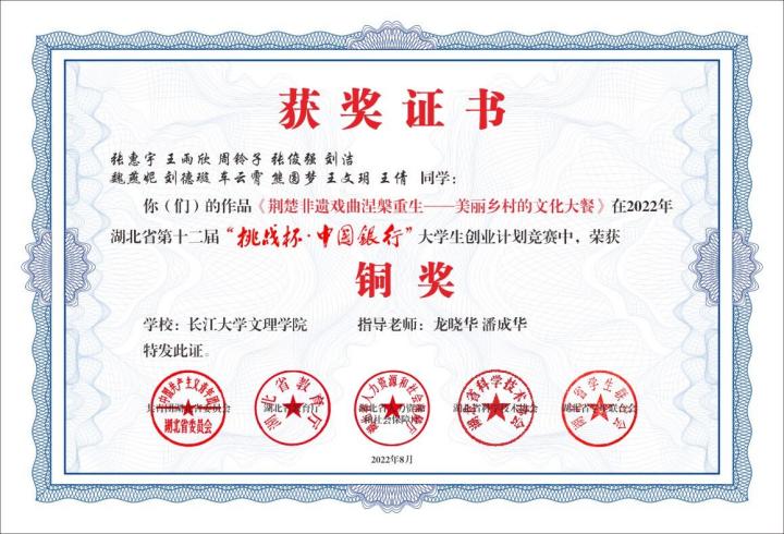 2022年8月,参与湖北省第十二届“挑战杯•中国银行”老员工创业计划竞赛,获铜奖