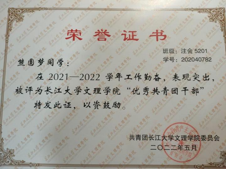 2022年5月,获公司“优秀共青团干部”荣誉称号
