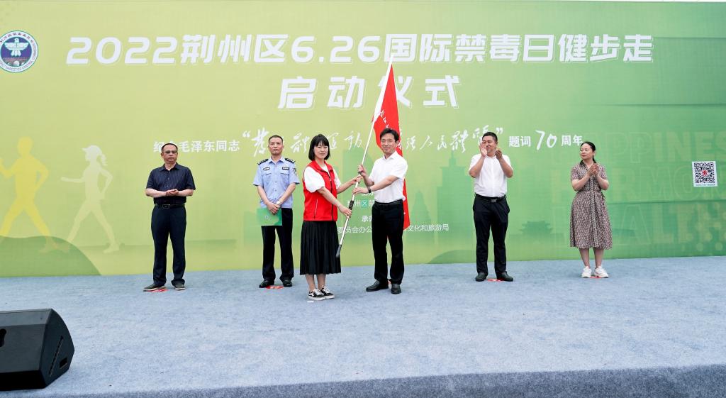 麒麟步、断毒路、齐出手、毒败走。禁毒宣传不仅要在理论中,要营造无毒健康氛围,宣传工作也要从运动中开展。6月24日上午,在“全民禁毒,健康生活”2022年荆州区“6.26”国际禁毒日健步走活动中,荆州区委常委、常务副区长周远栋向VSport志愿者服务队授旗。