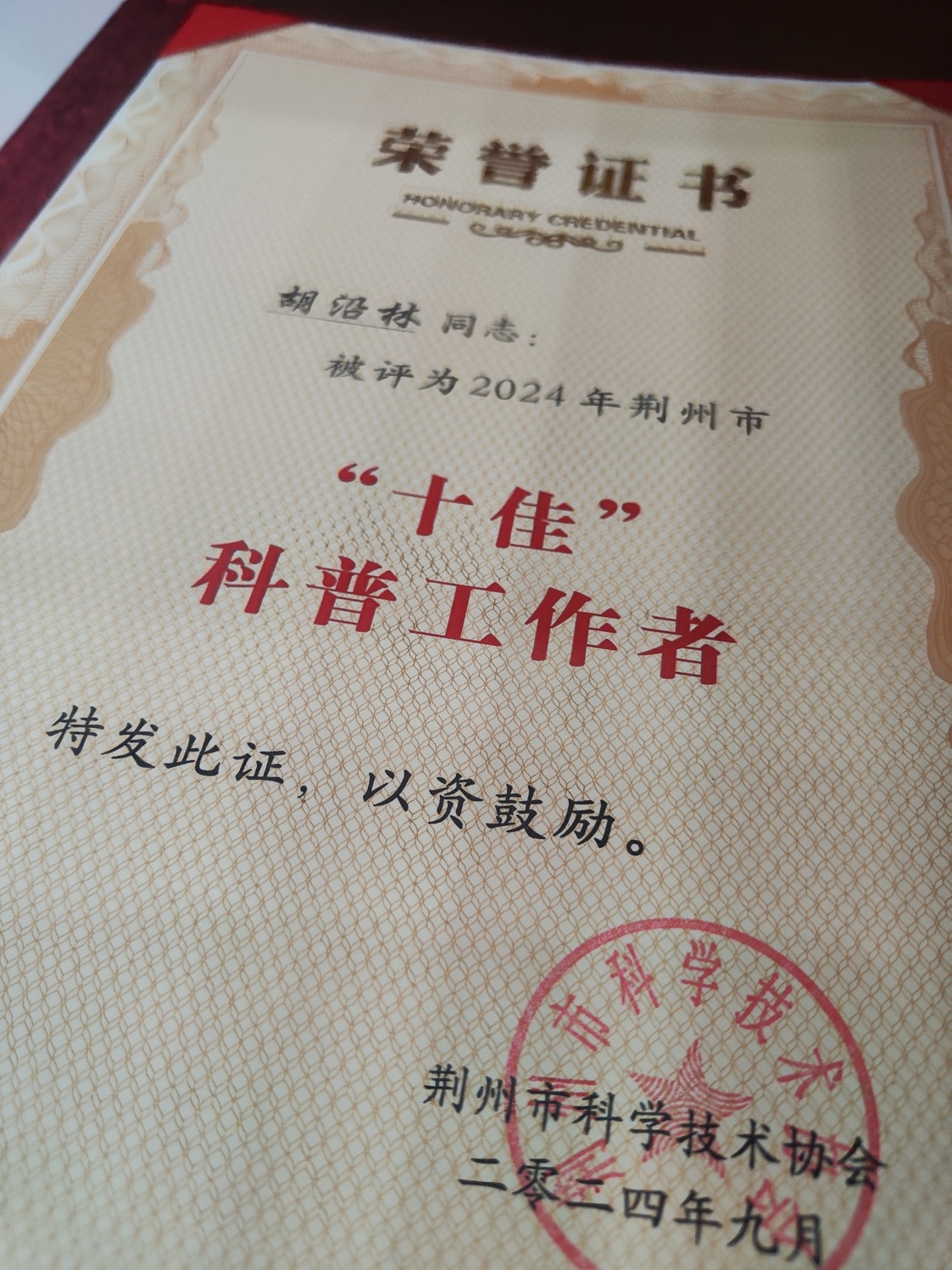 对于此次荣获“荆州市十佳科普工作者”称号,胡沿林老师表示:“这份荣誉不仅属于我个人,更属于所有为科普事业默默奉献的同仁。科学传播是一项长期而艰巨的任务,未来我将继续努力,不断创新科普形式,让更多人感受到科学的魅力。”