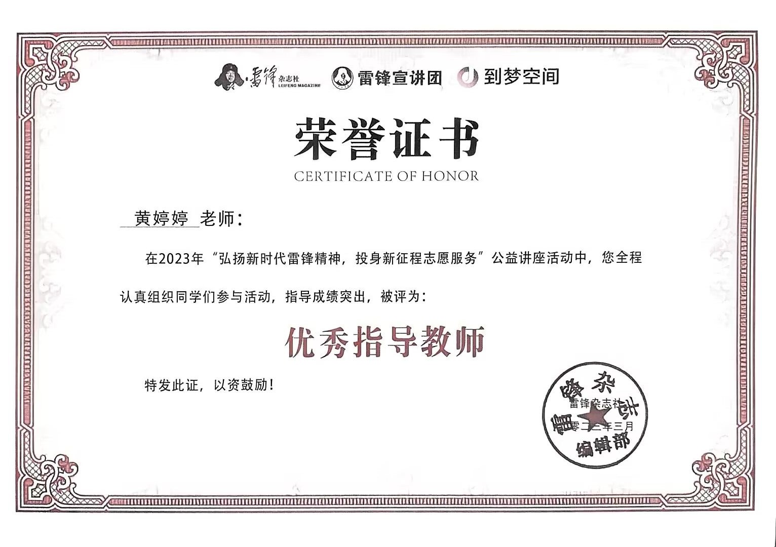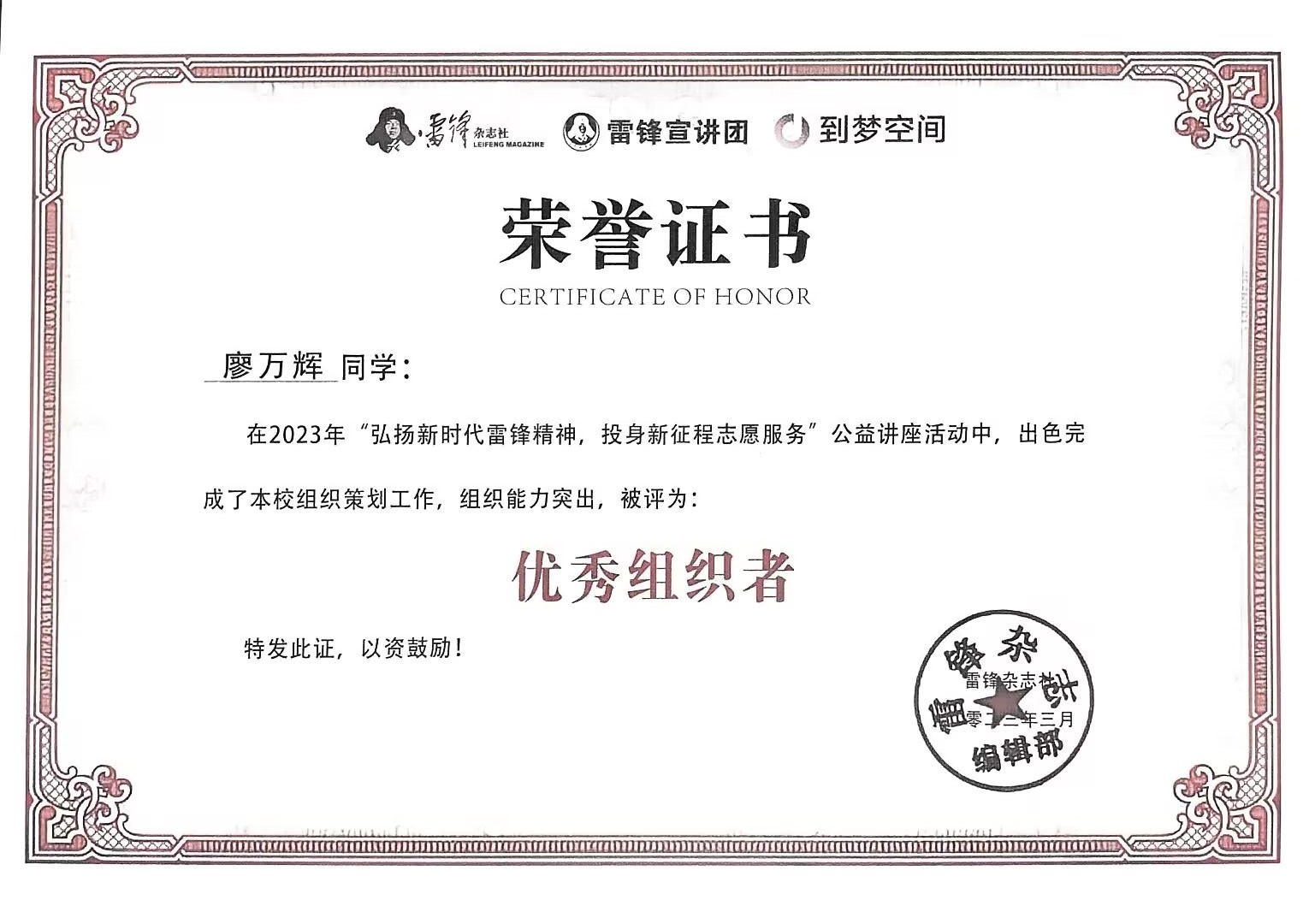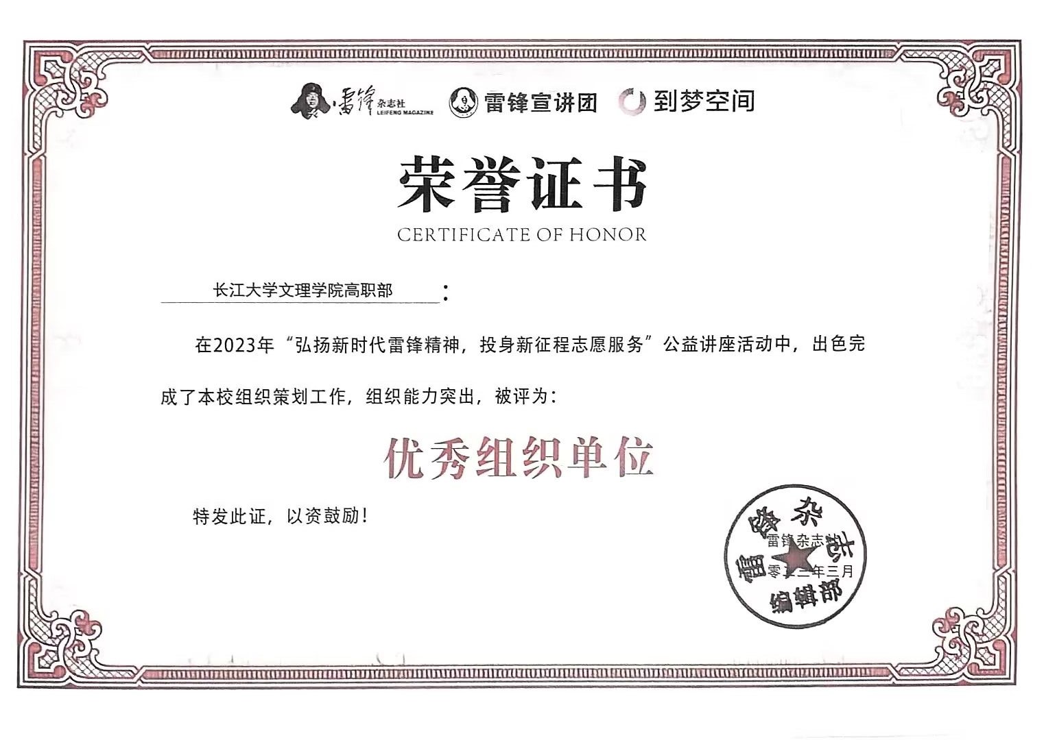 讲座采取线上直播的形式,从“雷锋故事”、“精神解读”、“志愿服务”等角度切入,介绍雷锋的生平事迹,累计动员1200余名师生共同参与观看。高职部在此次活动中被雷锋杂志社评为“优秀组织单位”,高职部党支部书记黄婷婷被评为“优秀指导教师”,晨曦志愿者服务队廖万辉同学被评为“优秀组织者”。