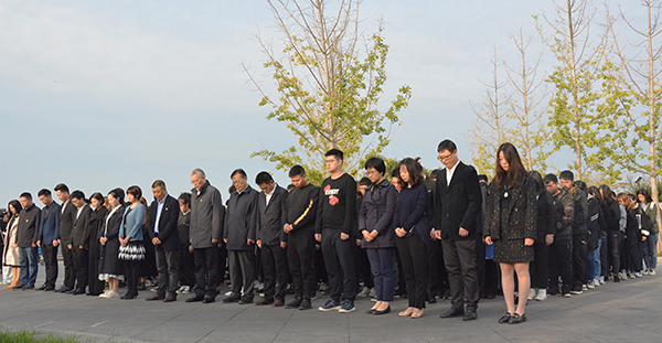 祭奠仪式包括宣读祭文、默哀、向烈士敬献黄菊等环节。伫立在庄严肃穆的“人链”碑前,全体人员怀着凝重的心情追思英烈,聆听新生代表宣读祭文。全体默哀三分钟后,冯征、周从标、朱继平、孙细望等领导及英雄集体代表依次将黄菊放在纪念碑前,深深鞠躬。