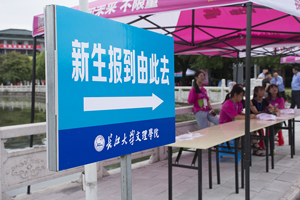 下午2点,550名迎新工作人员全部到位,分别在入学资格审查处、绿色通道办理处、缴费处、校外接待点等岗位做好准备工作。新生报到流程图、车辆引导图等各类指示展板与宣传条幅布置妥当。