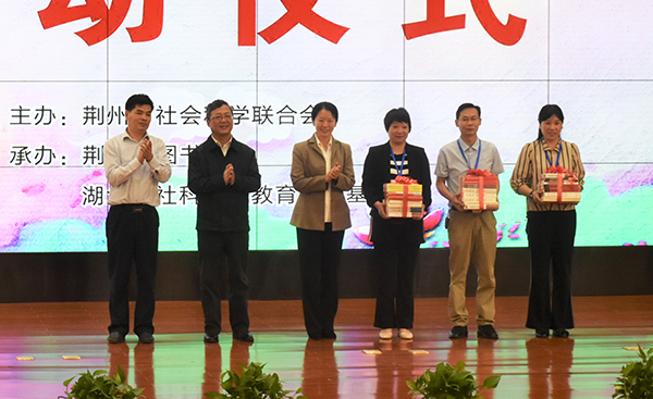 荆州市社科联党组书记贺洪文宣读湖北省第八届社会科学普及周荆州分会场活动方案。周宏智向市图书馆赠送社会科学普及读物。