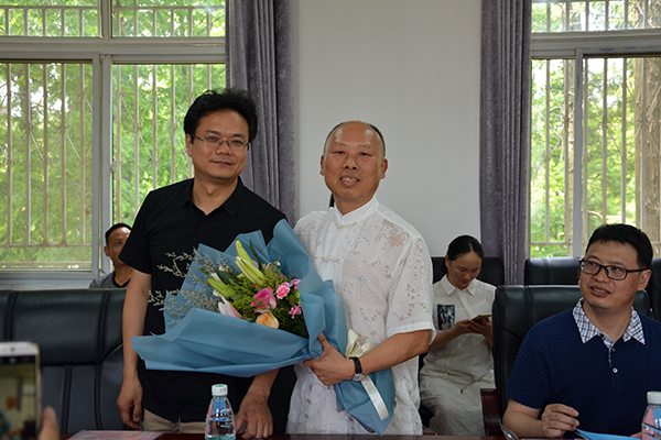 会议间隙,杨章池向大学时的老师罗勋章献上鲜花。全体与会人员在玄宫塘畔合影留念。