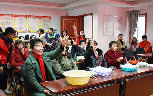 志愿者们为老人们送去了精彩的文艺表演。大家像儿女一样,亲切的陪伴在老人身边,话家常、看节目、秀才艺,气氛温馨而和谐。志愿者同学登台献唱了歌曲《隐形的翅膀》和《海阔天空》,他们用动人的旋律、昂扬的歌词和丰富的寓意,鼓励老人们以豁达开朗的心态快乐生活。老人们一边欣赏精彩的节目,一边兴高采烈的加入“正话反说”、“歌词接龙”等互动小游戏。抢答正确者,立刻现场领取一件生活日用品作为奖励。整个下午,这群年逾花甲的老人们沉浸在久违的儿女亲情中、陶醉在春天一般的温暖中,一个个笑逐颜开,开心得像孩子。
