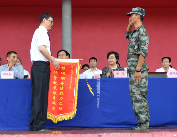孙细望代表公司向荆州军分区教导大队赠送锦旗,全体起立鼓掌欢送教官。