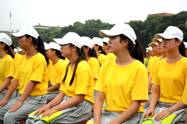 阅兵式上, 10个新生军训方队迈着整齐划一的步伐依次通过主席台,他们步伐坚定、队形整齐、口号嘹亮,自信昂扬,展现着十余天的训练成果。