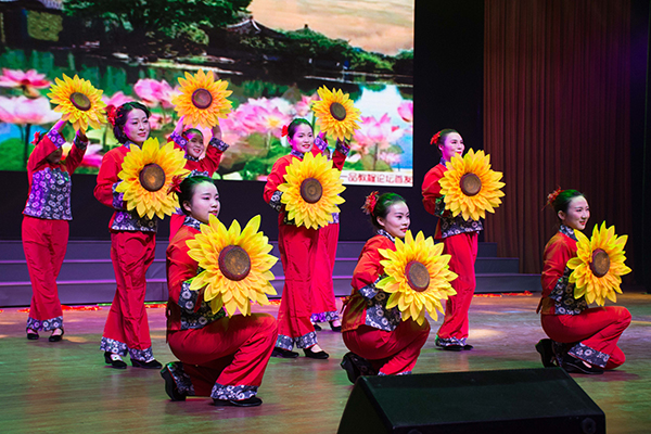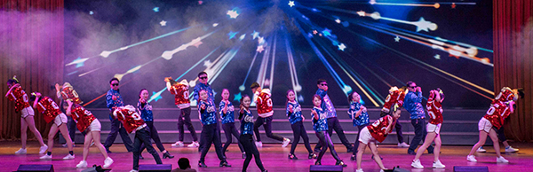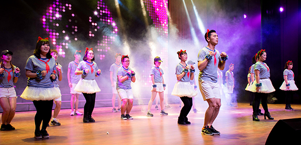 19点,在一片欢呼声中,开场舞《唱起来 跳起来》点燃了全场,拉开晚会序幕。公司行政职能部门、各教学单位的老师和老员工艺术团的同学,以及VSport医公司、校外舞蹈俱乐部的嘉宾们,同台表演了大合唱《映山红》、拉丁舞《舞魅》、音乐情景剧《因为爱情》、古典舞《彩云追月》、汉舞《礼仪之邦》、街舞《舞蹈之王》、诗朗诵《长征》、傣族舞《彩云之南》、双人舞《默》、现代舞《大小姐 走吧》、歌曲《故乡有话告诉你》、情景剧《过河》、印度舞《神秘面纱》、歌伴舞《美丽中国》等节目,现场在欢乐气氛中一次又一次掀起了高潮。