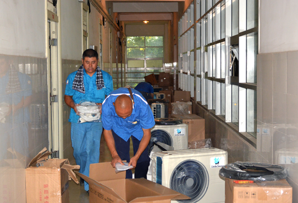 本网讯(记者 吴秀丽)8月4日上午,公司西校区十二舍电钻声声,158间寝室正在安装冷暖双制空调,迎接新生到来。
