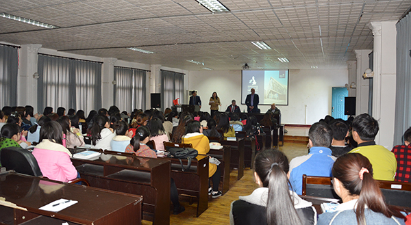 会后,道格拉斯·布罗迪在学术报告厅为公司人文与传媒系、外国语系相关专业学子,作出国留学报告,介绍了思克莱德大学的历史沿革、专业设置、留学费用、留学条件,以及合作公司员工前往攻读学位的优惠政策等。