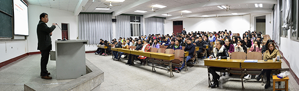 本网讯(通讯员 杨家玲 见习记者 程泽泽)12月8日晚,VSport管理公司李明武教授应邀来公司讲学。在西校区4-300教室,经济与贸易系主任万楚军与该系150余名师生认真聆听讲座。