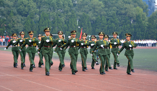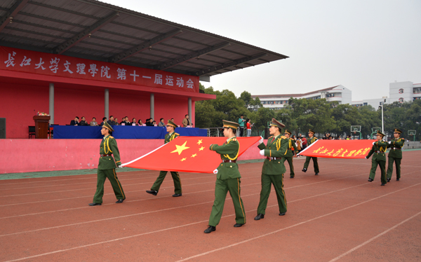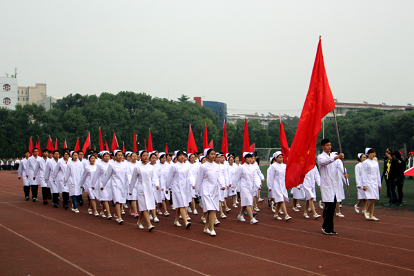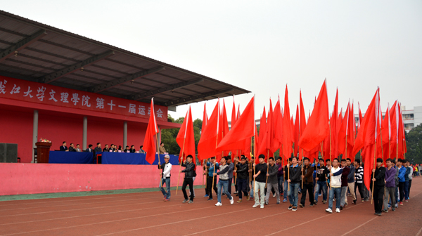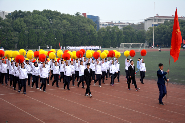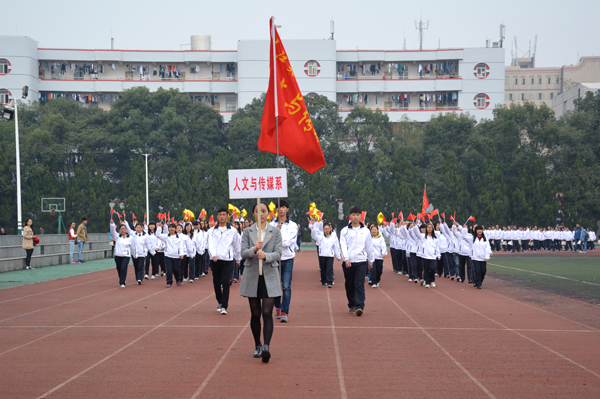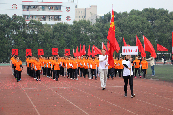 国旗队旗手擎着鲜艳的五星红旗,身着整齐的制服,英姿飒爽,迈着矫健的步伐通过主席台。师生共同组成的裁判队步伐整齐一致,精神饱满,怀着“公平公正”的信念大步向前。经济与贸易系的同学们高举“精贸易、通管理、善营销、懂商法”的标语,手拿红黄鲜花,踏着有力的步伐勇往直前。黄色的星星组成“人文”二字,鲜红的旗帜在手中随风飘扬,同学们面带微笑,彰显人文学子的青春活力。外国语系的同学们手拿红黄两色灯笼, 一起一落,别样风景。 机电与信息工程系的同学们头戴红蓝相间的头盔,显得格外醒目,朝气蓬勃。身着雪白色护士服和医生制服的是来自医药与护理系的方阵,他们精神饱满,斗志昂扬。“风华管理,无与伦比,齐心协力,共创佳绩。”工商管理系的健儿们喊着嘹亮的口号,向空中抛出绚丽的礼花。穿着鲜亮的橙色衣服,高举“设计之家欢迎你”标语,建筑与设计系方阵独具一格,个性十足。