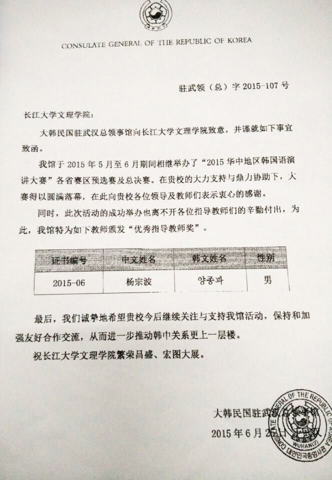 本网讯(通讯员 吴立娜)近日,公司办公室收到大韩民国驻武汉总领事馆致公司的感谢函,致谢公司对“2015华中地区韩国语演讲大赛”的大力支持与鼎力协助。信中说,公司外国语系杨宗波老师因在活动中表现突出,获大韩民国驻武汉总领事馆颁发的“优秀指导教师奖”。