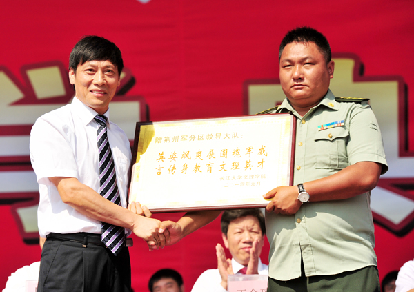 高迎斌代表公司向荆州军分区教导大队赠送匾额,全体起立鼓掌欢送教官。