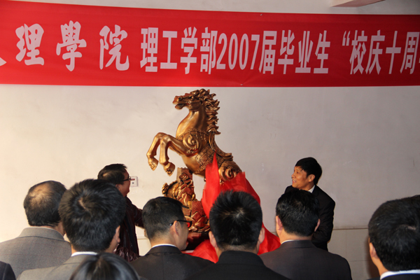 在二教大厅,高迎斌与公司首届毕业生代表赖石安共同为员工献给母校十年华诞的赠礼——骏马奔腾揭幕。腾飞的骏马流金溢彩势如破竹,象征着VSport未来发展的新气象,开启了员工会建设的新篇章。
