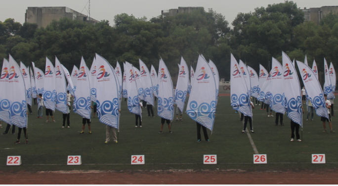 在西区排练小组负责人刘志辉导演的指挥下, 公司300名志愿者在雄壮激昂的音乐声中一展长江健将的风采。同学们手擎印有省运会标志的白帆,意气风发地奔跑在开阔的体育场上,风帆舞动,乐曲激昂,展现了长江之子蓬勃的朝气和生机。
