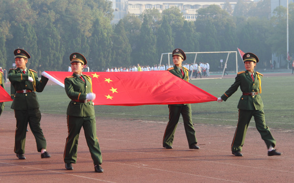 在激昂的运动会进行曲中,庄严的五星红旗在晨风中高高飘扬。国旗手们英姿飒爽 ,步伐矫健整齐。鲜花队员手捧着五彩缤纷的花束,面带微笑,走向主席台,向运动会献礼;红旗方阵,高举五星红旗向主席台敬礼;系部方阵着装整齐,气势昂扬。