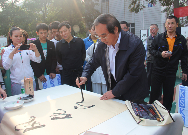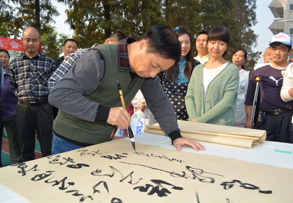 悠扬的古琴声中,邓官林、沈光明为活动开笔。邓官林的草书笔酣墨饱,挥洒自如,一纸狂草浑然天成;沈光明的行书遒劲雄奇,浑然古朴,“春风化雨”四个大字,博得观众热烈的掌声。