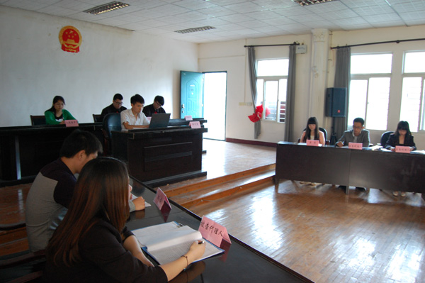 模拟法庭出庭人员包括:审判长、审判员、书记员、原告及其诉讼代理人、被告及其诉讼代理人。活动中人物角色采用员工真实姓名,事件如实按照李阳离婚案。本次“模拟法庭”以疯狂英语创始人李阳与妻子Kim的离婚案为原型,法学5131班同学王博林和李佳婧分别饰演被告和原告,法学5131班陈政亮饰演审判长。此外,还有7名法学专业同学参加活动。