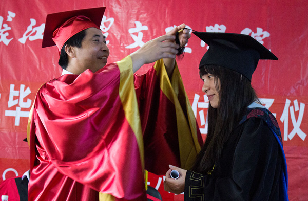 毕业典礼结束后,院领导王金琼、郭睦庚、汪邦柱、王学峰分别在工会大厅和学术报告厅为机电与信息工程系、经济与贸易系、工商管理系、外语系、建筑与设计系和人文与传媒系毕业生颁发学位证书并援正流苏。