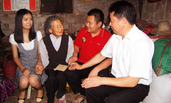 公司党委副书记汪邦柱和“10.24”英雄学子昌子琪(左一)、李立科(右二)慰问贫困老人