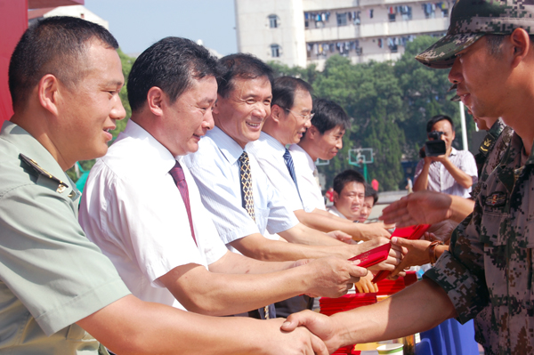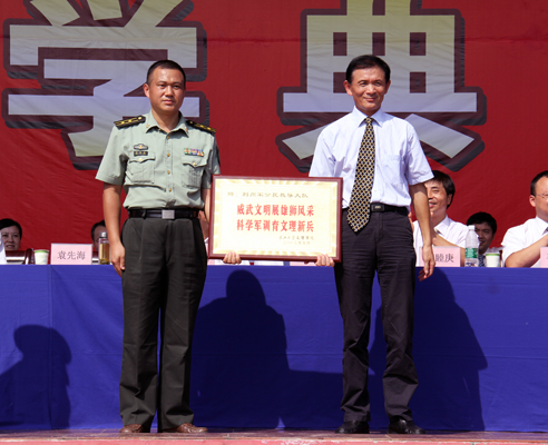 公司党委书记袁先海代表公司向荆州军分区教导大队赠送匾额,全体起立鼓掌欢送教官。