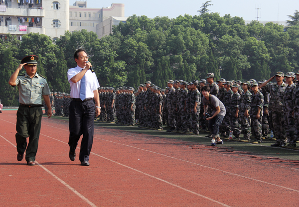 公司经理沈光明教授(右)在陈继梁副参谋长的陪同下检阅新生军训方阵