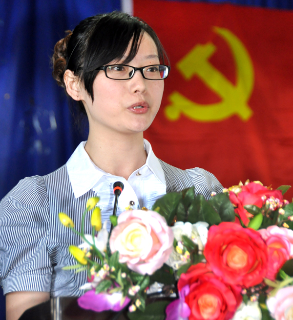 庄严的旋律响起,与会人员全体起立奏《国际歌》,本次大会正式拉开帷幕。306名党员在鲜艳的党旗下庄严宣誓,员工干部、国贸5091班的毛娟作为毕业生党员代表发言。