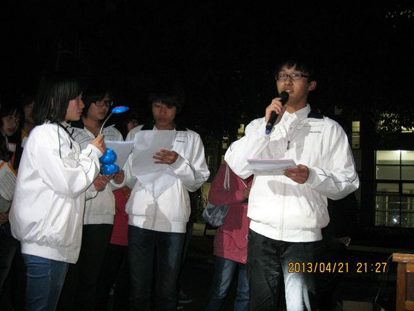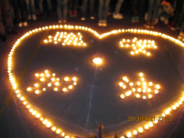 4月21日晚9点,公司西区知行学社在12舍楼下举办了一场以“雅安·加油!”为主题的祈福活动。一首首感人的歌曲从活动现场传来,一句句坚定的口号从同学们的口中传出,吸引了百余师生驻足观看。知行学社负责人在操场中心用蜡烛摆出了一个爱心和“雅安·加油”四个大字,同学们纷纷围在爱心周围,点上红烛,心中默哀。中文5121班的周旭同学表示,虽然不能亲临雅安地震灾区进行救援,但他希望在现场协助搜救的志愿者都能怀有烛火一般的热情,为灾民送去一线生机,送上一丝暖意。