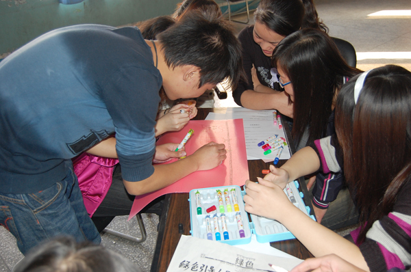 “信任之旅”是本次活动的高潮,两人一组,一位扮盲人,一位扮助盲者,“盲人”在助忙者的帮助搀扶下越过层层障碍,完成艰难的旅程。这个活动让同学们真正懂得在恐惧和无助的时候充分相信自己的朋友。在“集体作画”环节,每个团队共同完成一幅画,然后分别在小卡片上写下自己最想说的话作为这次活动的礼物送给朋友。