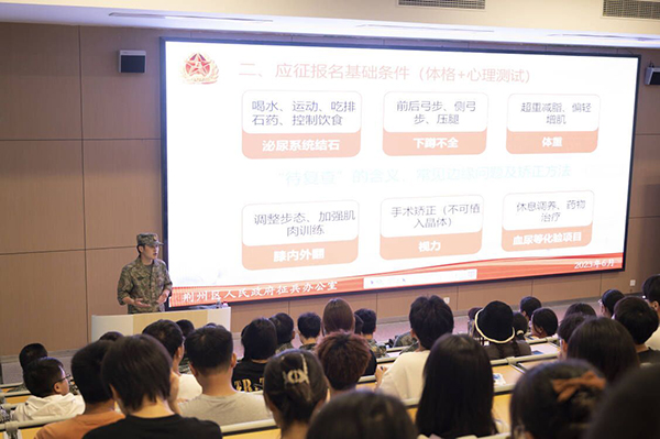 本网讯(通讯员 陈健)6月6日晚,公司2023年度秋季征兵宣讲会在主教多功能报告厅举办,荆州市人武部军事科参谋何强就参军入伍的基本条件、报名流程、义务兵与直招士官的不同之处进行了详细讲解,公司征兵工作负责人、老兵团成员以及各教学单位员工代表参加活动。