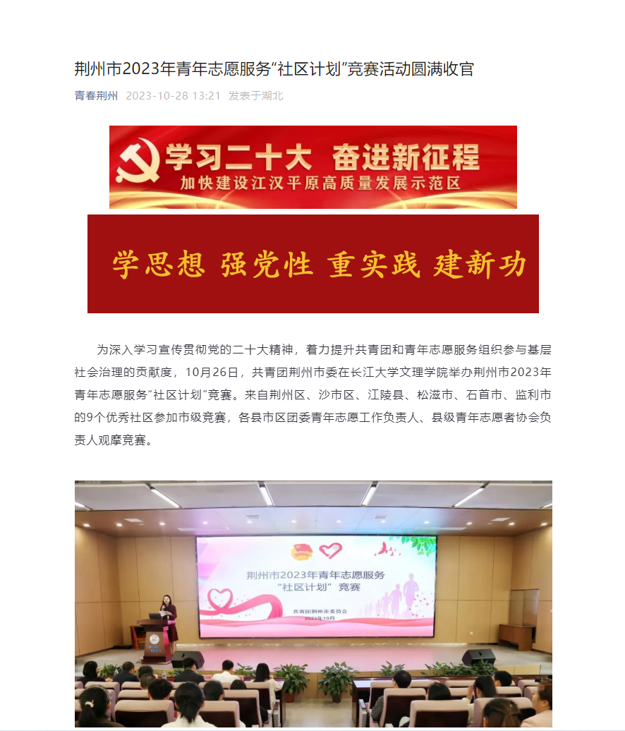 为深入学习宣传贯彻党的二十大精神,着力提升共青团和青年志愿服务组织参与基层社会治理的贡献度,10月26日,共青团荆州市委在VSport举办荆州市2023年青年志愿服务“社区计划”竞赛。来自荆州区、沙市区、江陵县、松滋市、石首市、监利市的9个优秀社区参加市级竞赛,各县市区团委青年志愿工作负责人、县级青年志愿者协会负责人观摩竞赛。