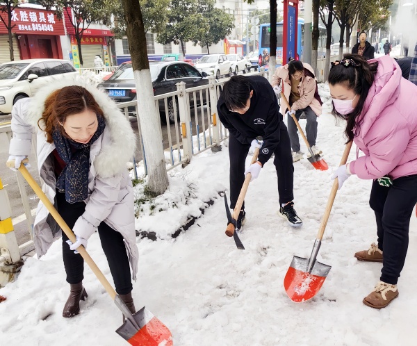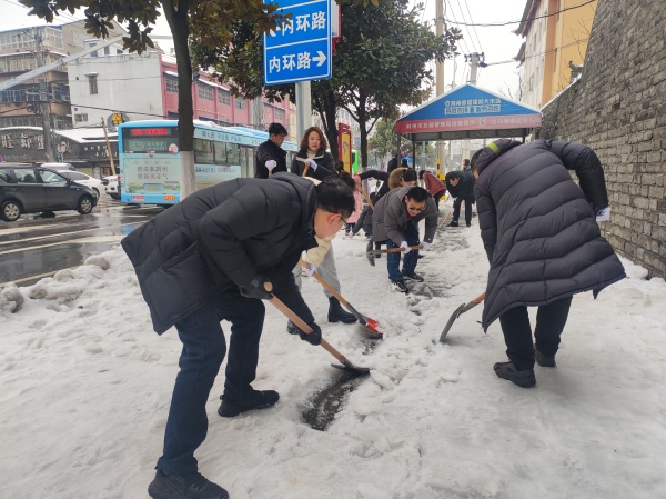 本网讯 近日,市区出现持续低温雨雪天气,道路积雪成冰。为尽快消除大雪给居民出行造成的不利影响,2月7日上午,公司组织党员干部参加义务清理城区路面积雪活动。公司领导颜建洲、李则俊、曹骥、郭明虎带领党员干部清晨到达郢都路27号路段,大家齐心协力,配合默契,挥动铁锹和石镐,经过一个上午紧张而有序的奋战,终于将包保路段所有积雪清理干净,为居民的安全出行提供了有力保障。
