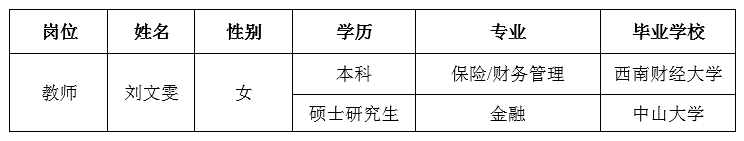 2018年4月28日,公司组织了金融学专业专任教师的招聘考核工作,经资格审查、专家考核、公司党政联席会议讨论通过,现将录用人员名单公示如下: