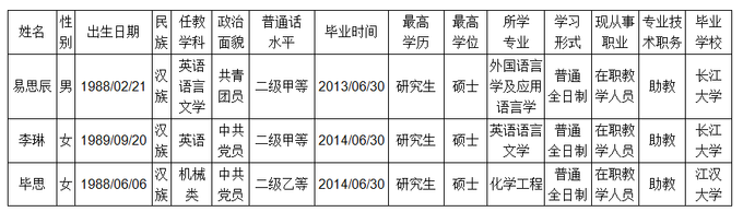 根据湖北省教育厅《关于2016年高校教团队格认定工作安排的通知》精神,经教师本人申报,各系、部初审,人力资源处现场确认,通过下列同志的教团队格证申请,现公示如下:
